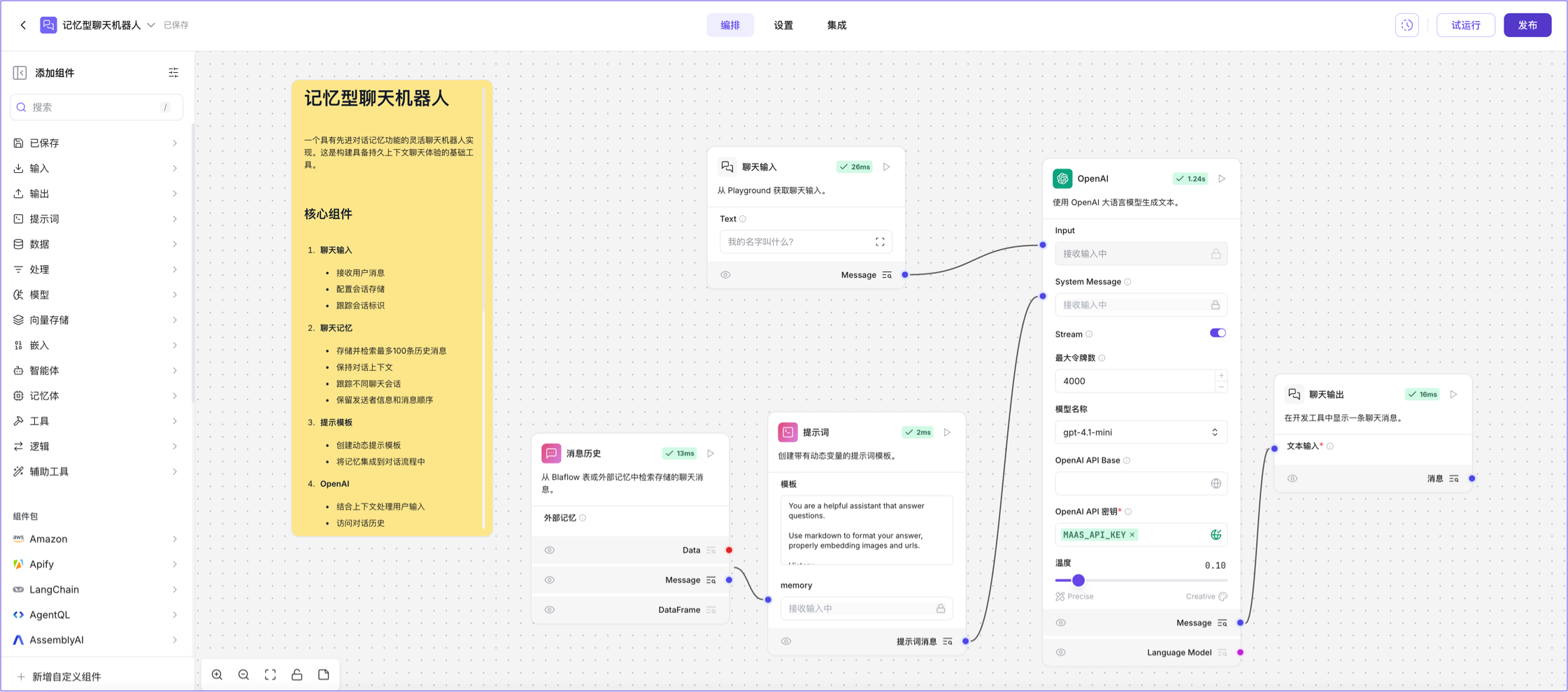 消息历史 组件连接到这个端口,用于存储来自 试运行 的聊天消息,并为 OpenAI 组件提供之前聊天消息的记忆。