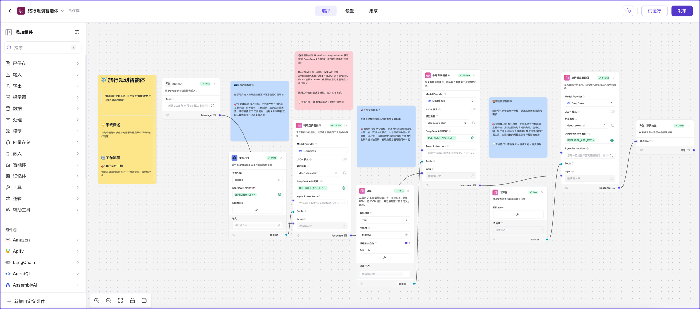 所有智能体都可以访问 搜索 API 和 URL 内容提取器 组件,而只有 旅行管家智能体 可以使用 计算器 计算旅行费用。